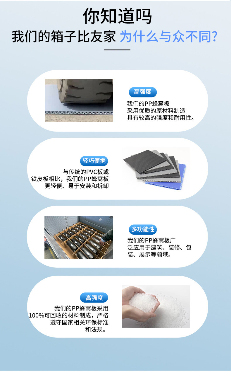 PP蜂窝板作为环保板材,在使用中不产生灰尘,寿命长,可回收利用;主要应用于产品包装,PP蜂窝板材质轻,尺寸可按照需求定制,具有承重和抗压力强、耐压耐冲击、结实耐用等特点,咨询电话:1881628343